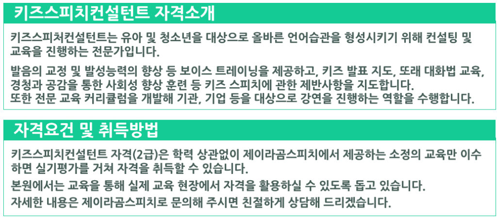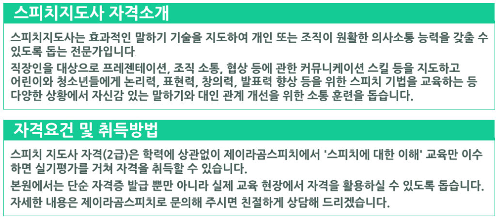 Speech Certification Exam 스피치 자격 검정 홈 · 스피치 자격시험 Certification 01 스피치지도사 (SCI : Speech & Communication Instructor) 본 자격은 자격기본법 제17조에 의거, 국무총리 산하 국책연구기관인 한국직업능력연구원에 정식 등록 되었으며, 제이라곰스피치의 운영규정에 따라 자격의 관리와 자격증 발급이 합법적으로 이루어지고 있습니다.ㆍ주무부처기관 : 교육부ㆍ자격등록기관 : 한국직업능력연구원ㆍ교육운영 및 자격발급기관 : 제이라곰스피치 (검정기획관리실) 자격증 발급과정 카톡 문의 Certicafation 02 키즈 스피치 컨설턴트 (KSC : Kids Speech Consultant) 본 자격은 자격기본법 제17조에 의거, 국무총리 산하 국책연구기관인 한국직업능력연구원에 정식 등록 되었으며, 제이라곰스피치의 운영규정에 따라 자격의 관리와 자격증 발급이 합법적으로 이루어지고 있습니다. ㆍ주무부처기관 : 교육부 ㆍ자격등록기관 : 한국직업능력연구원 ㆍ교육운영 및 자격발급기관 : 제이라곰스피치 (검정기획관리실) 자격증 발급과정 카톡 문의